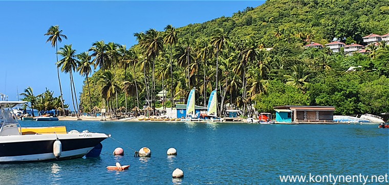 Do Pitonów jest dość daleko i trudno znaleźć tani transport przez morze. Po zwiedzeniu miasta (zwraca uwagę wiekowe drzewo przed katedrą) zdecydowałem wybrać sie do zatoki Marigot, gdzie nakręcono kilka fabularnych filmów. Lokalny mikrobus do skrzyżowania w pobliżu zatoki kosztuje tylko 1 dolara USA. Potem jest do przejścia około 2 kilometrów i: |