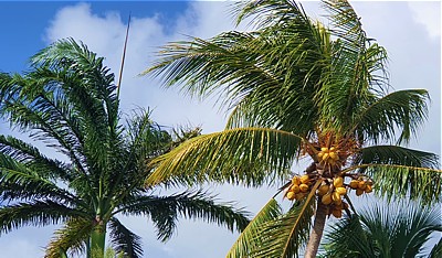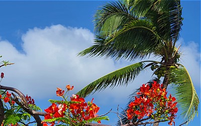 W okolicach stoczni, ale nie tylko podziwiałem okazy karaibskiej przyrody: tropikalne drzewa, owoce i kwiaty. Na tle błękitnego nieba prezentowały się bardzo efektownie. Przy tym codziennie słupek rtęci w południe niezmiennie pokazywał 29 stopni : |