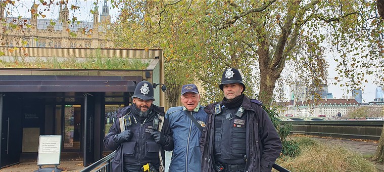 The next day we docked in Southampton, from where I took a bus trip to London, a two-hour drive away. I hadn't been back for quite a few years, and it was worth revisiting old haunts by walking from Victoria Station along the Thames to the Houses of Parliament, and then to Buckingham Palace. The policemen—the English "Boobies"—were happy to pose for a photo: |