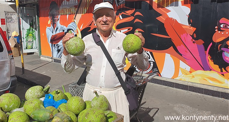 Tym razem w drodze powrotnej na statek pogadałem sobie z ulicznym sprzedawcą owoców. Nie chciał się fotografować (miejscowi są na to uczuleni), ale chętnie zrobił moje zdjecie z jego breadfrutami: |