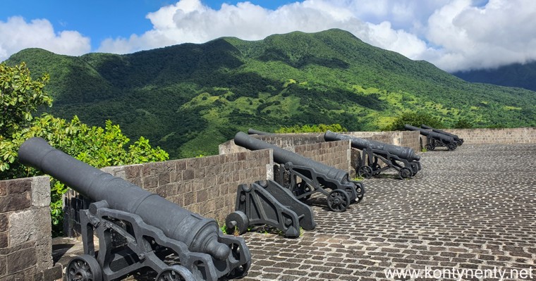 Ja wolałem po zwiedzeniu stolicy pojechać lokalnym mikrobusem płacąc 4 USD w każdą stronę do podnóża fortecy Brimstone. Stamtąd trzeba iść jakieś 2 km pod górę i zapłacić 15 USD za wstęp. Ale warto, bo zbudowana przez Brytyjczyków forteca jest imponunująca i stoi w scenerii pięknych, zielonych gór: |