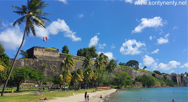 Dotarliśmy w końcu do Martyniki. Tu też mieszkają głównie czarnoskórzy, ale to już inna kultura i inny poziom życia pod skrzydłami Francji. Stolicy wyspy Fort-de-France bronił potężny fort Fort Saint Louis, niestety w dalszym ciągu zajęty przez wojsko. Ale pod murami fortu, o krok od Starego Miasta jest niewielka plaża ocieniona palmami, gdzie można się kąpać: |