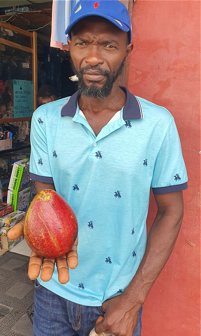 In Roseau, it's worth visiting the modest botanical garden, which boasts gigantic tropical trees (see the photo on the left column). Locals (descendants of Native Americans and African slaves) sell interesting fruits on the streets. For the first time in my life, I saw a bright red mango: |