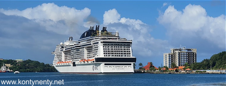 Kingston - stolica republiki ma ładne, brukowane podcienia w głównej ulicy, w ogrodzie botanicznym drzewo chlebowe słynnego kapitana Bligha i dwie katedry - tam chodzą turyści. Ale do Fortu Charlotte wspina się niewielu. Mnie się jeszcze raz udało. Przy temperaturze 29 stopni jest to wyzwanie... Fort był otwarty, zrobiłem zdjęcia z murów. I mogę wam pokazać jak prezentował się z wysokości 190 metrów nasz piękny statek zacumowany w zatoce: |