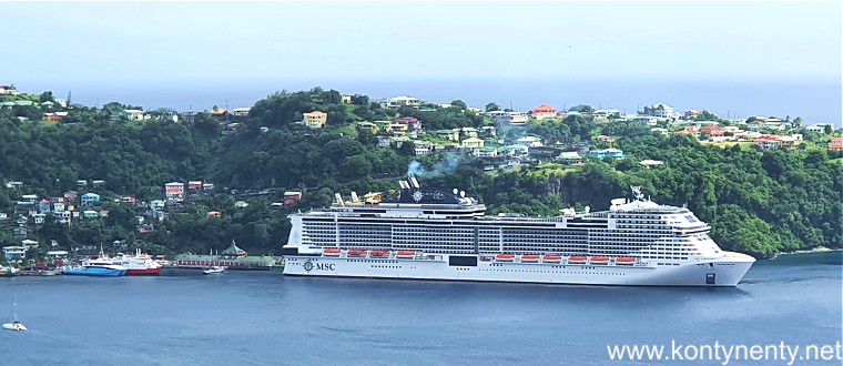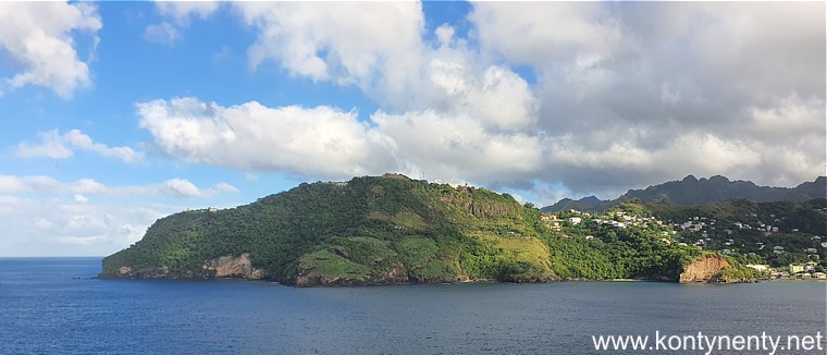 St Vincent i znacznie mniejsze Grenadyny rozrzucone są na Morzu Karaibskim szerokim łukiem. Odwiedziliśmy główną wyspę tego państwa. Stolica kraju leży w głębi zatoki zamkniętej górzystym cyplem (zdjęcie poniżej). Na szczycie tego półwyspu w czasach kolonialnych zbudowano Fort Charlotte. Zamierzałem kolejny raz wspiąć sie do fortu dla pięknego widoku: |