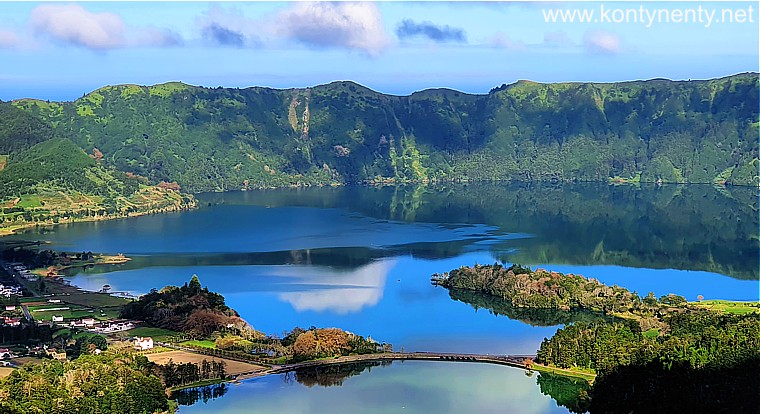 Trzecim portem w naszym rejsie był francuski Le Havre, w którym byłem dwa miesiące wcześniej i który został już w tym rozdziale opisany. Po zabraniu z tym porcie pozostałych pasażerów z Francji wzięliśmy kurs na portugalskie Azory, Trzeciego dnia żeglugi zawinęliśmy do Ponta Delgada na wyspie Sao Miguel. Nareszcie było ciepło i słonecznie! Korzystając z publicznych autobusów i autostopu dotarłem do krajobrazowej atrakcji tej wulkanicznej wyspy: jezior leżących w dawnych wulkanicznych kalderach: |
